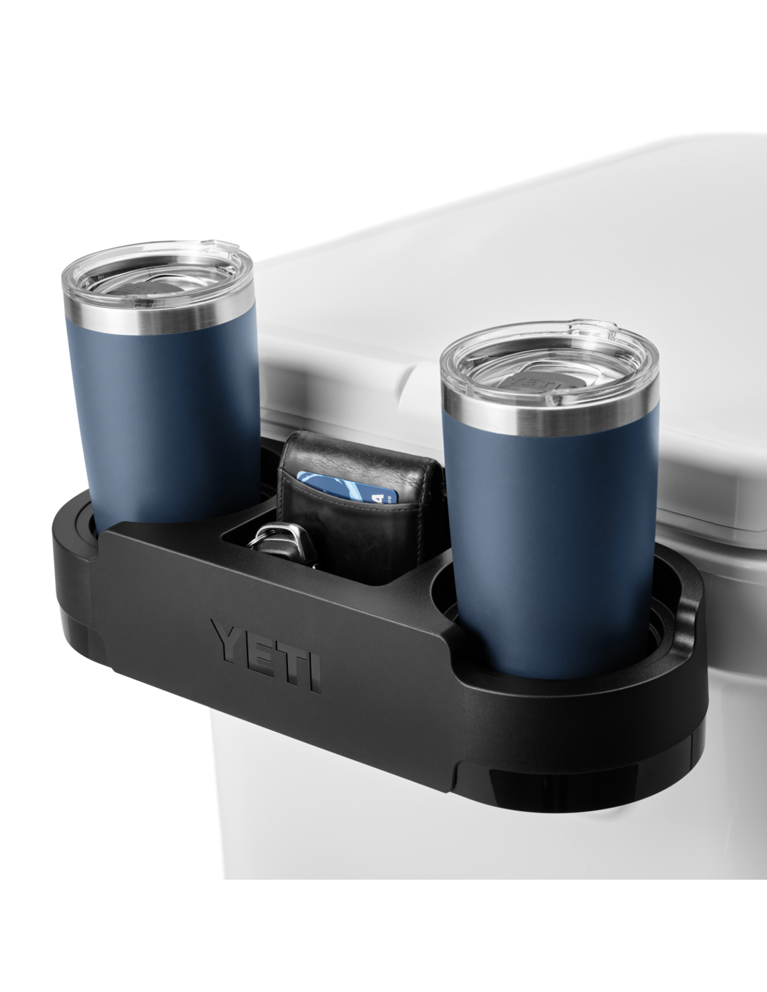 Deixeu la vostra beguda tot mantenint la mercaderia a l'interior accessible amb un caddie de tasses. Enganxeu-lo fàcilment al refrigerador de rodes Roadie® i obteniu a l'instant dos portavasos sense perdre la capacitat d'obrir la tapa. Mides per a la majoria de begudes Rambler®, tots els aïllants de llaunes Colster® i gairebé qualsevol llauna i coll llarg. La cavitat central també és un lloc perfecte per mantenir les claus, la cartera o les alicates de pesca a l'abast.